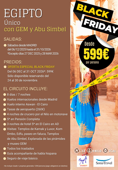 ➡️ Visitas: Templos de Karnak y Luxor, Kom Ombo, Edfu, paseo en faluca, Templos de Abu Simbel, Explanada de las pirámides y museo GEM